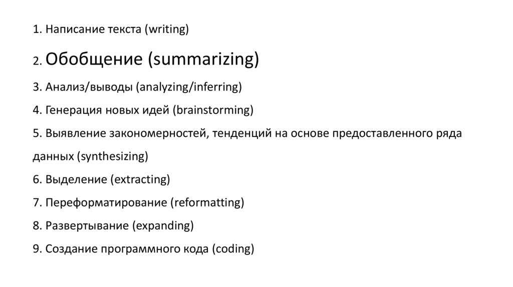 1. Написание текста (writing)2. Обобщение (summarizing)