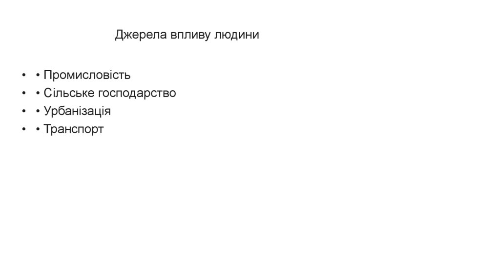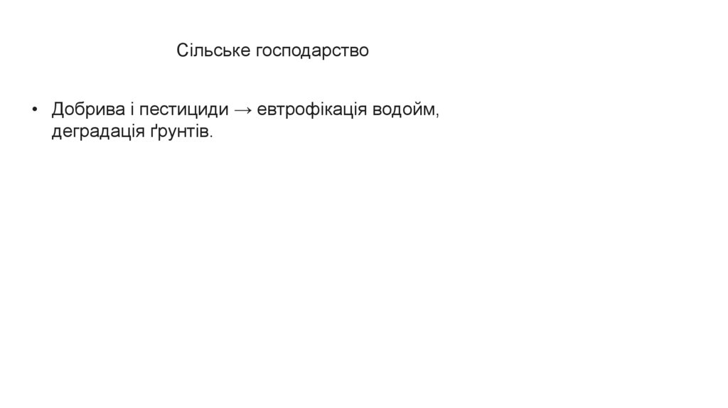 Сільське господарство• Добрива і пестициди → евтрофікація водойм,