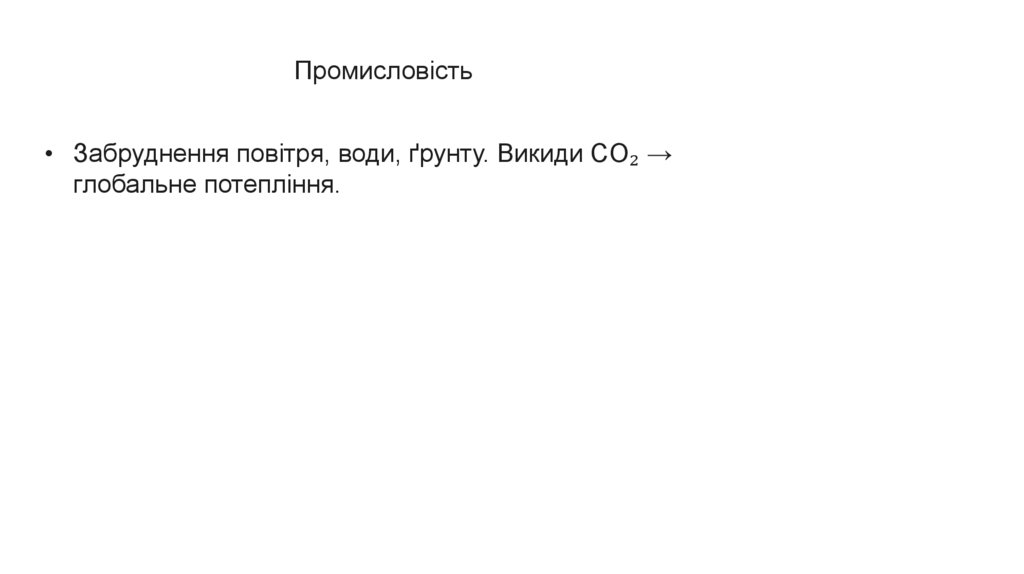 Промисловість• Забруднення повітря, води, ґрунту. Викиди CO₂ →