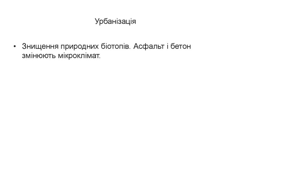 Урбанізація• Знищення природних біотопів. Асфальт і бетон