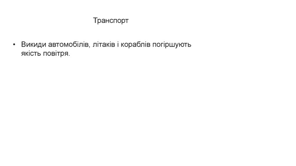 Транспорт• Викиди автомобілів, літаків і кораблів погіршують