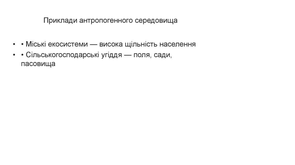 Приклади антропогенного середовища• • Міські екосистеми — висока щільність населення