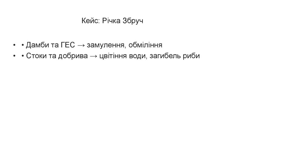 Кейс: Річка Збруч• • Дамби та ГЕС → замулення, обміління