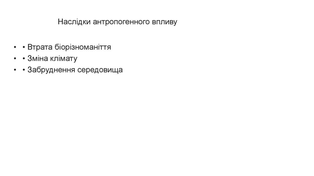 Наслідки антропогенного впливу• • Втрата біорізноманіття