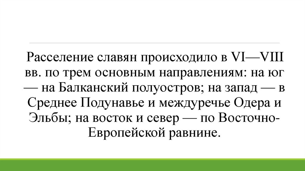 Расселение славян происходило в VI—VIIIвв. по трем основным направлениям: на юг
