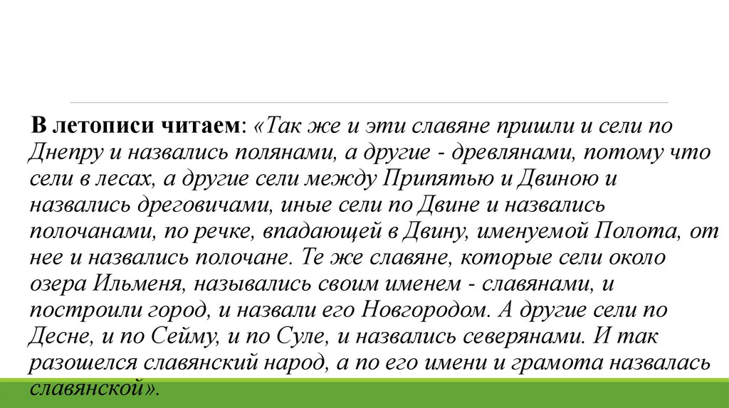 В летописи читаем: «Так же и эти славяне пришли и сели поДнепру и назвались полянами, а другие - древлянами, потому что