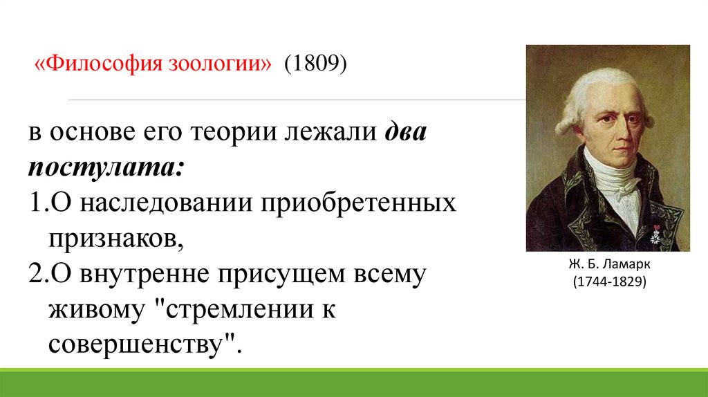 1. теория наследования приобретенных признаковЖ. Ламарка,