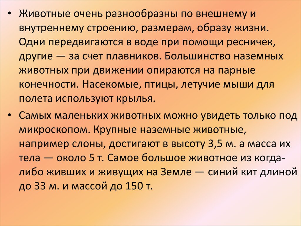 • Животные очень разнообразны по внешнему ивнутреннему строению, размерам, образу жизни.