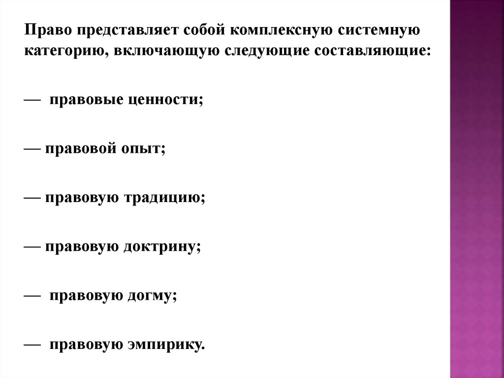 Право представляет собой комплексную системнуюкатегорию, включающую следующие составляющие: