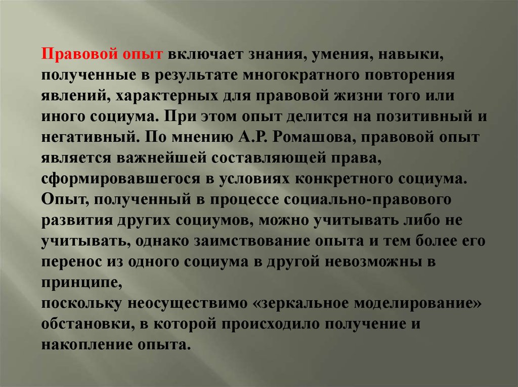 — правовой опыт;