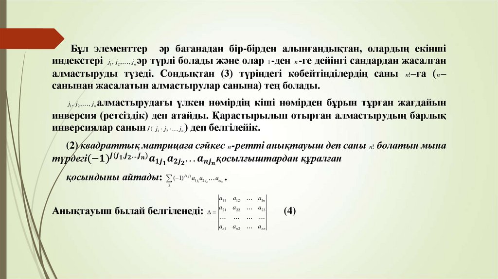 Бұл элементтер әр бағанадан бір-бірден алынғандықтан, олардың екіншіиндекстері j , j , , j әр түрлі болады және олар 1 -ден n -ге дейінгі сандардан жасалған