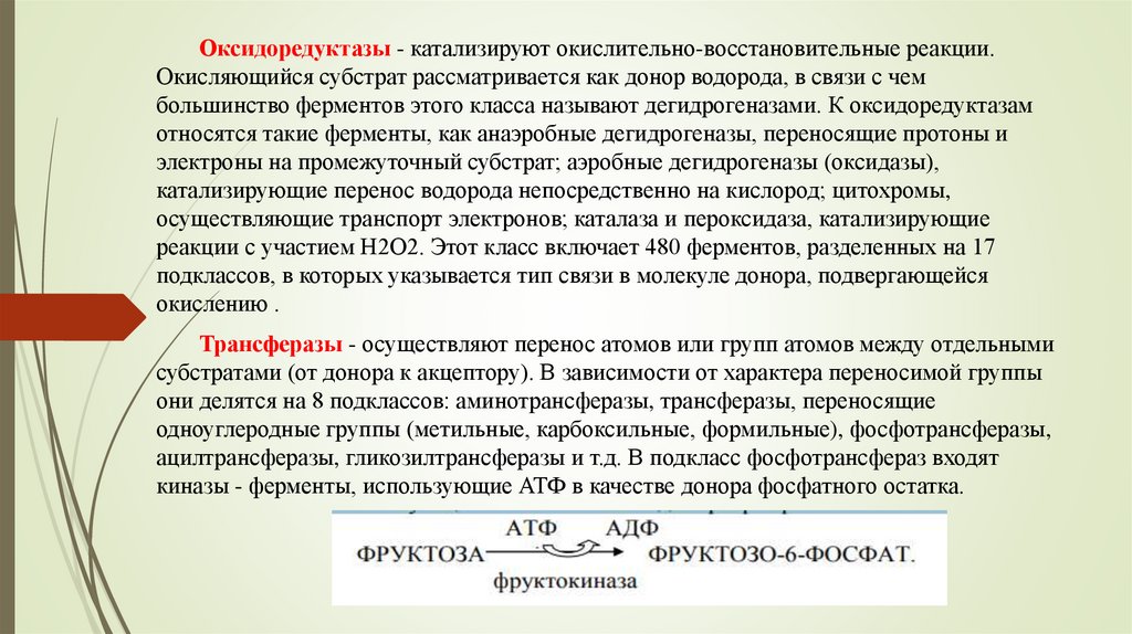 Оксидоредуктазы - катализируют окислительно-восстановительные реакции.Окисляющийся субстрат рассматривается как донор водорода, в связи с чем