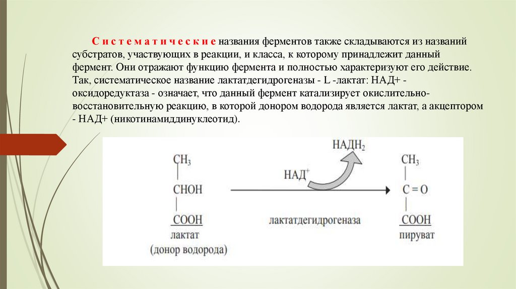 Так, систематическое название лактатдегидрогеназы - L -лактат: НАД+ оксидоредуктаза - означает, что данный фермент катализирует окислительновосстановительную реакцию, в которой донором водорода является лактат, а акцептором