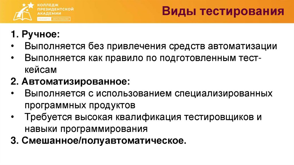 Виды тестирования1. Ручное: