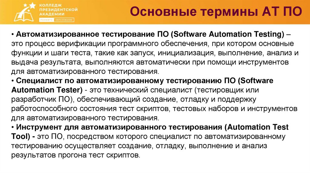 Основные термины АТ ПО• Автоматизированное тестирование ПО (Software Automation Testing) –