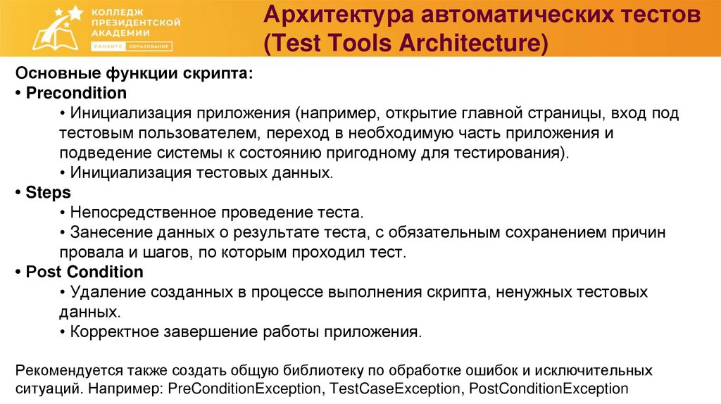 ситуаций. Например: PreConditionException, TestCaseException, PostConditionException