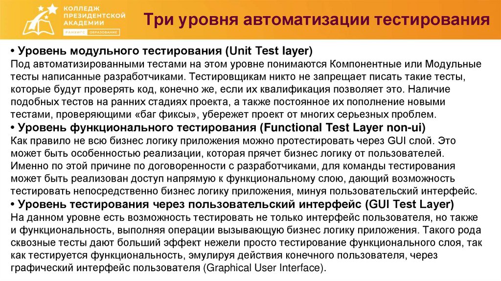 Три уровня автоматизации тестирования• Уровень модульного тестирования (Unit Test layer)