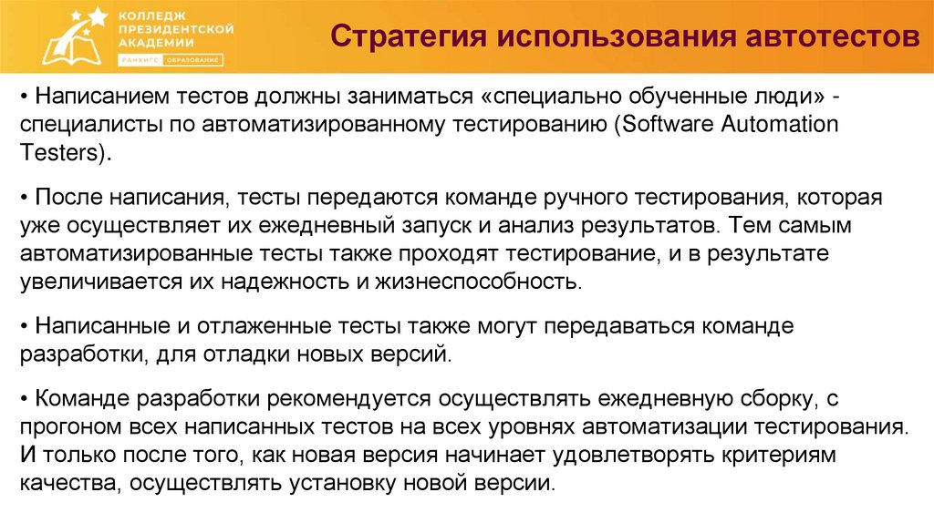 Стратегия использования автотестов• Написанием тестов должны заниматься «специально обученные люди» специалисты по автоматизированному тестированию (Software Automation