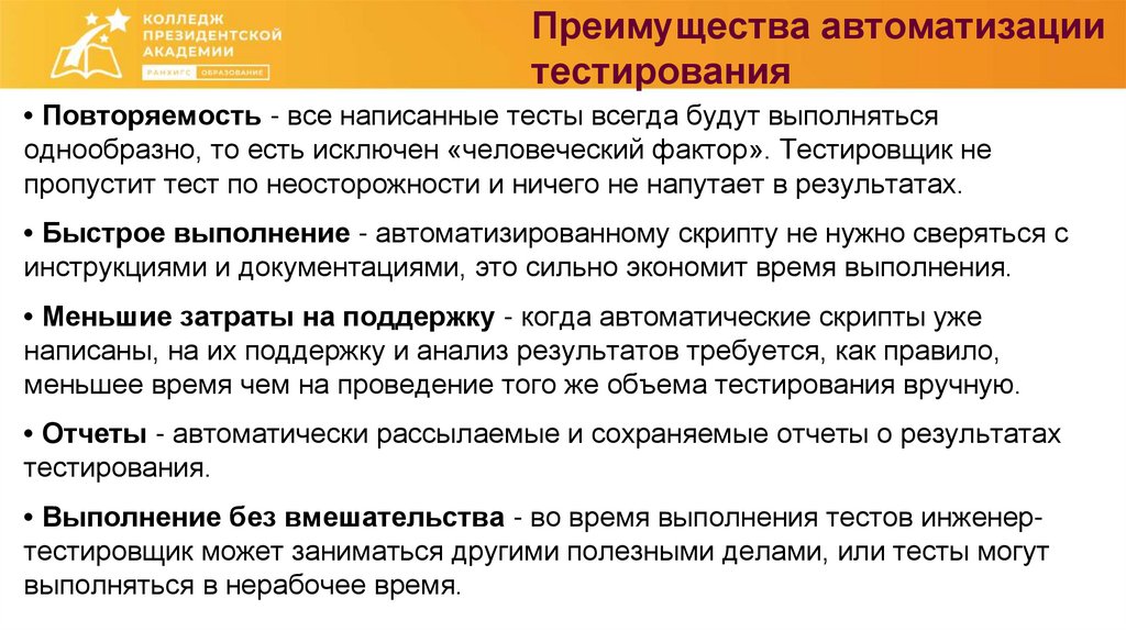 • Повторяемость - все написанные тесты всегда будут выполняться однообразно. Это
