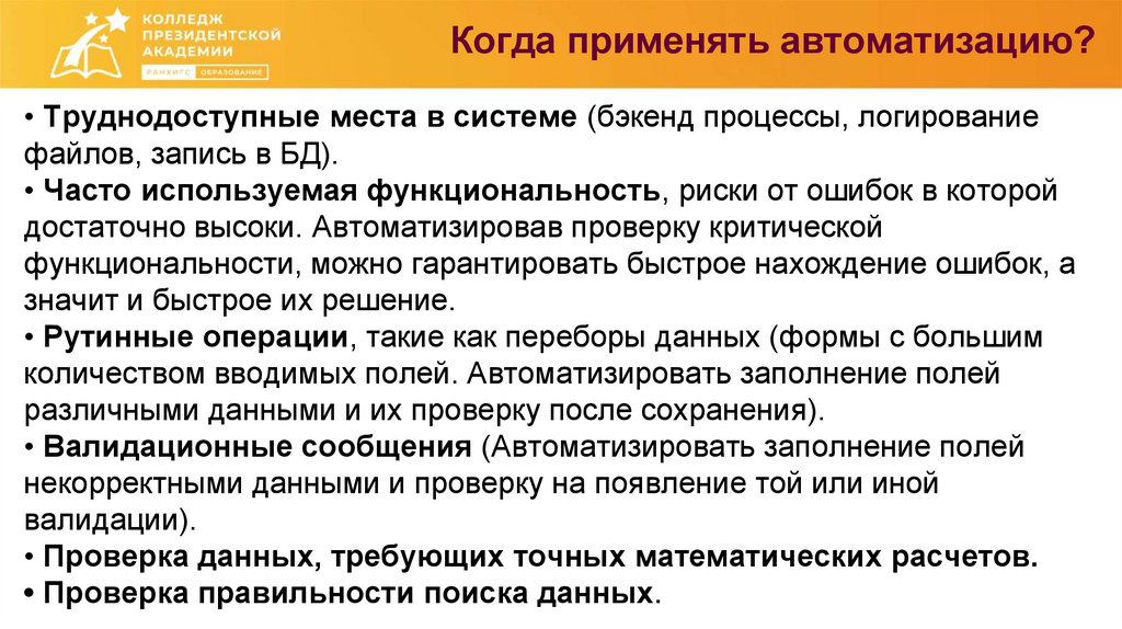 Когда применять автоматизацию?• Труднодоступные места в системе (бэкенд процессы, логирование