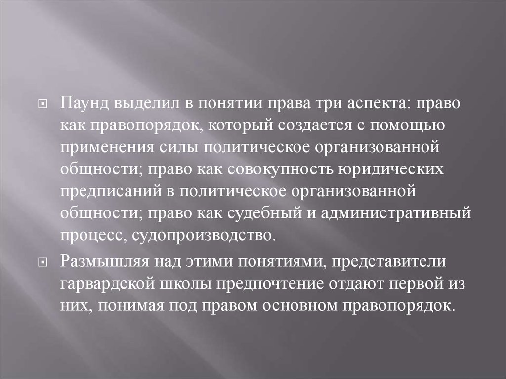 Паунд выделил в понятии права три аспекта: правокак правопорядок, который создается с помощью