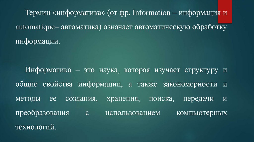 Термин «информатика» (от фр. Information – информация иautomatique– автоматика) означает автоматическую обработку