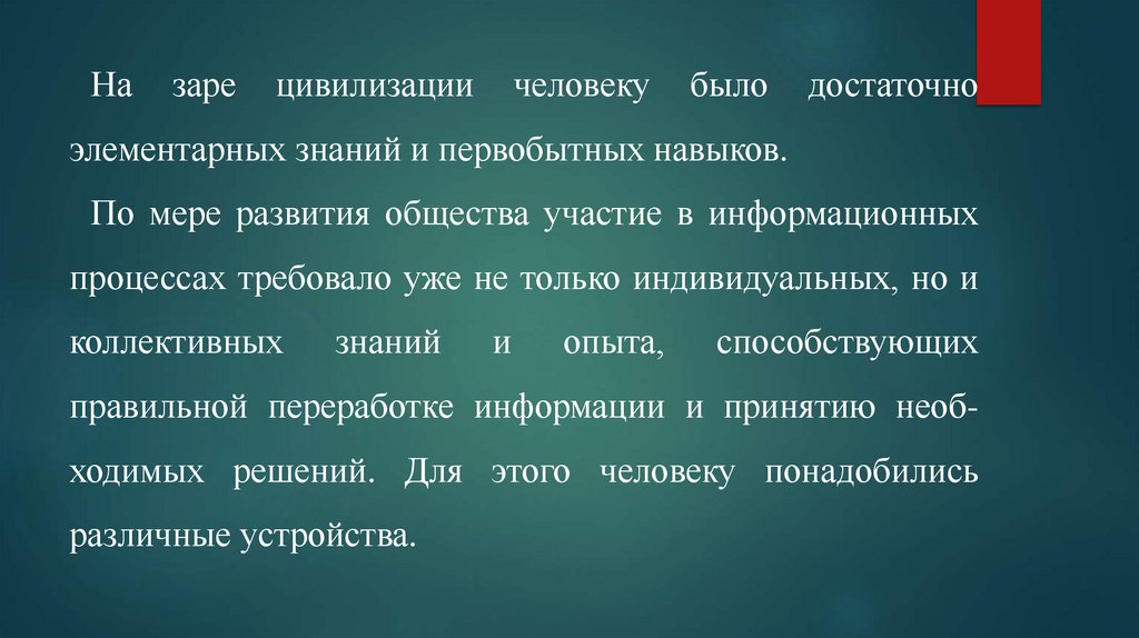 правильной переработке информации и принятию необходимых решений. Для этого человеку понадобились