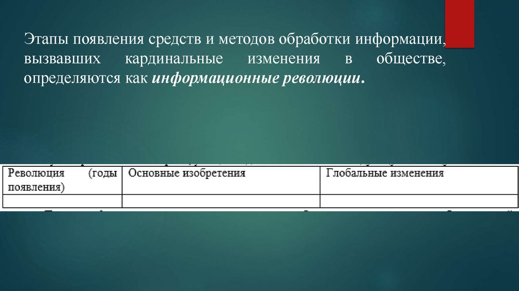 Этапы появления средств и методов обработки информации,вызвавших кардинальные изменения в обществе,