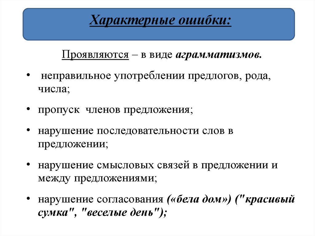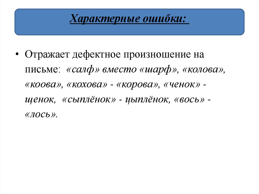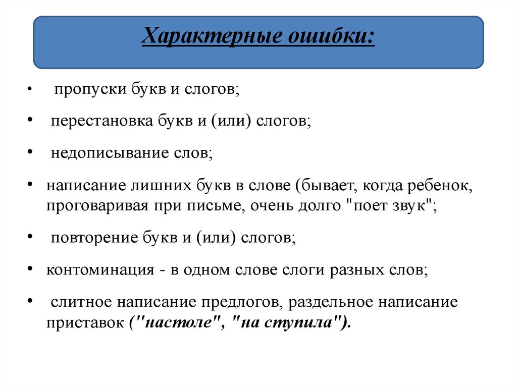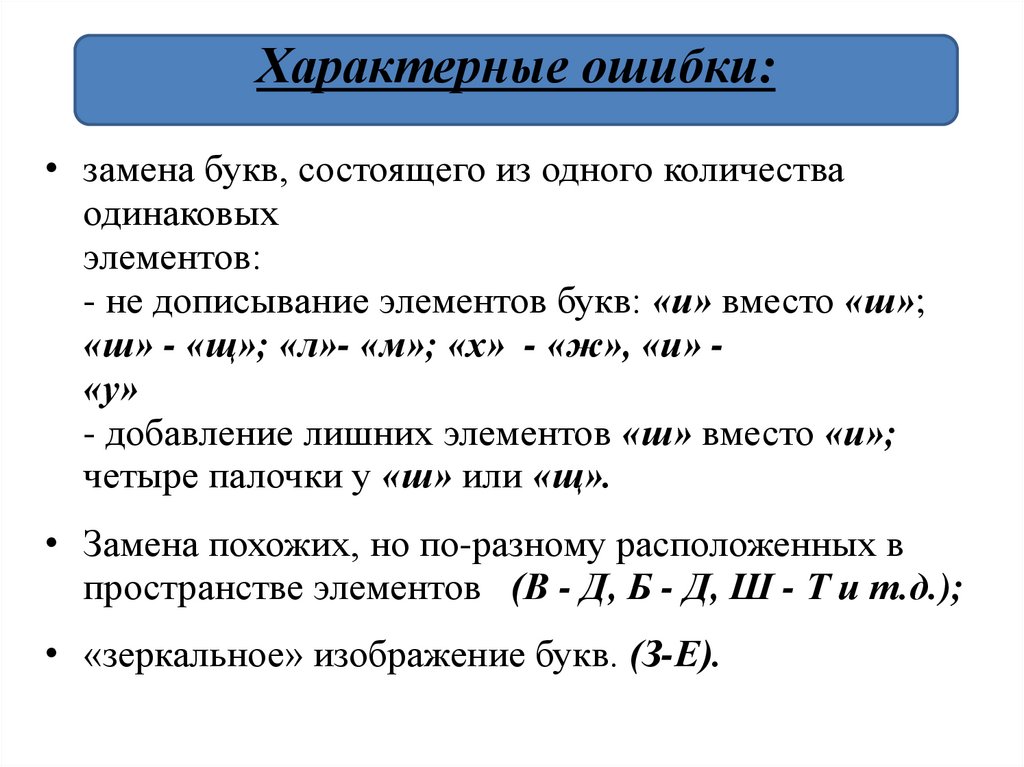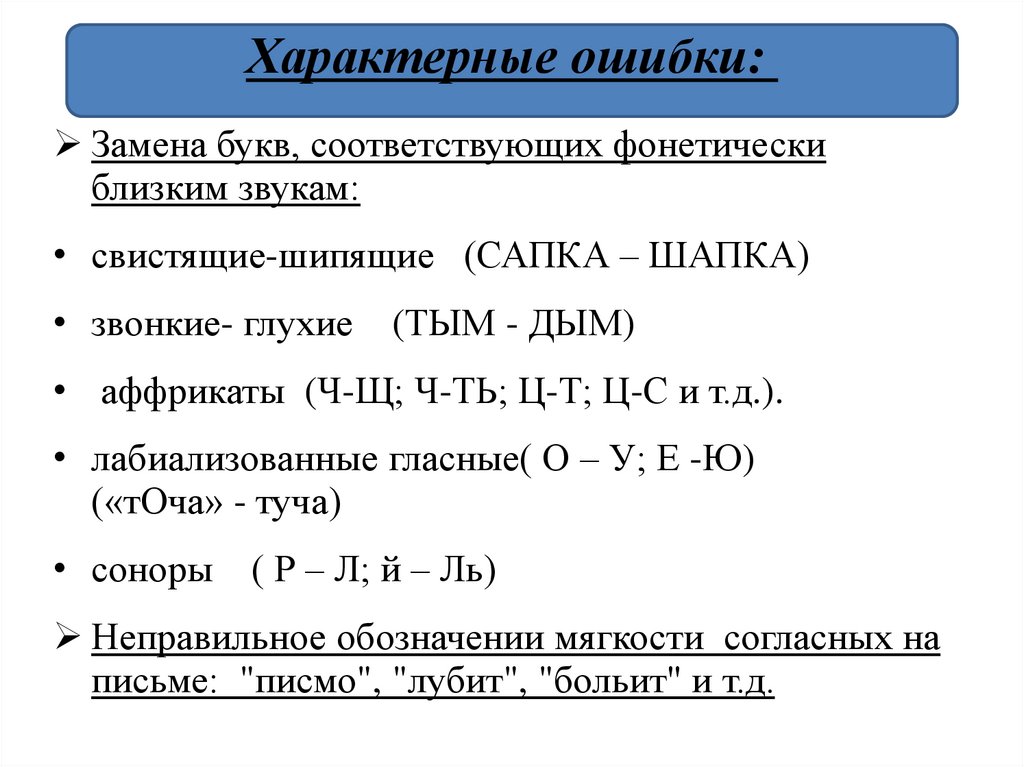 Характерные ошибки:Замена букв, соответствующих фонетически