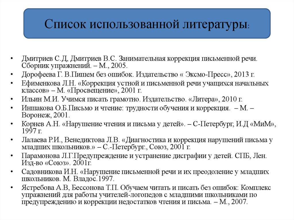 Список использованной литературы:Дмитриев С.Д, Дмитриев В.С. Занимательная коррекция письменной речи.