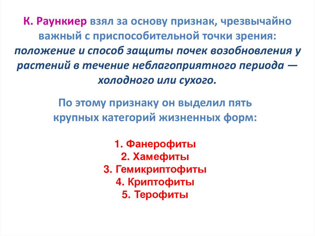 К. Раункиер взял за основу признак, чрезвычайноважный с приспособительной точки зрения:
