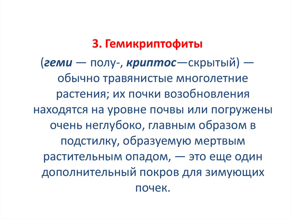 3. Гемикриптофиты(геми — полу-, криптос—скрытый) —