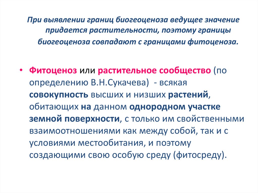 При выявлении границ биогеоценоза ведущее значениепридается растительности, поэтому границы