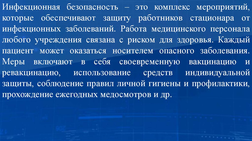 Инфекционная безопасность – это комплекс мероприятий,которые обеспечивают защиту работников стационара от