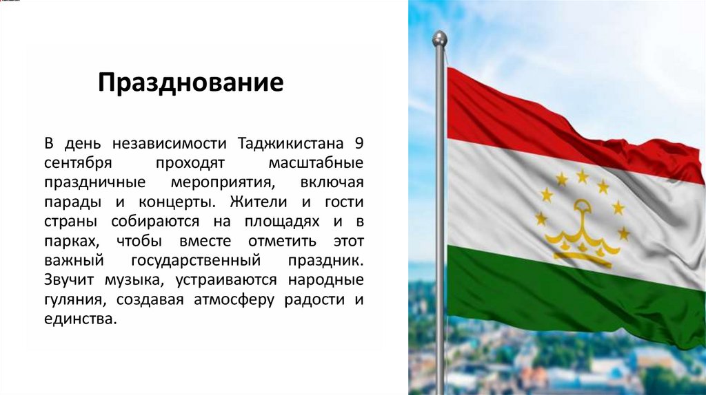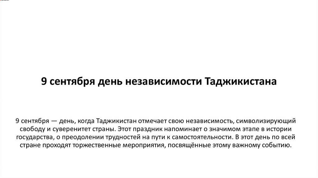 9 сентября день независимости Таджикистана9 сентября — день, когда Таджикистан отмечает свою независимость, символизирующий