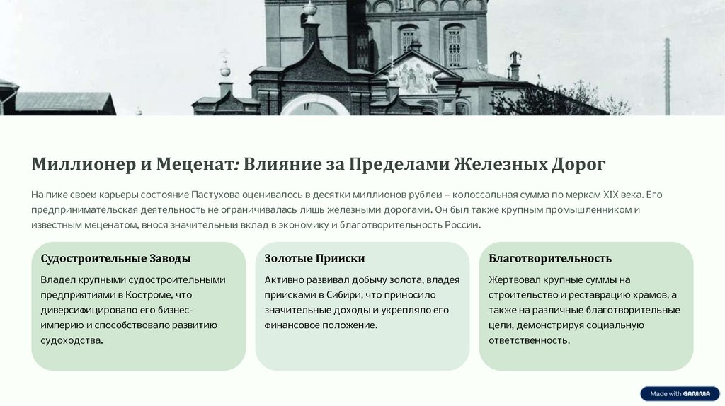 Миллионер и Меценат: Влияние за Пределами Железных ДорогНа пике своей карьеры состояние Пастухова оценивалось в десятки миллионов рублей — колоссальная сумма по меркам XIX века. Его