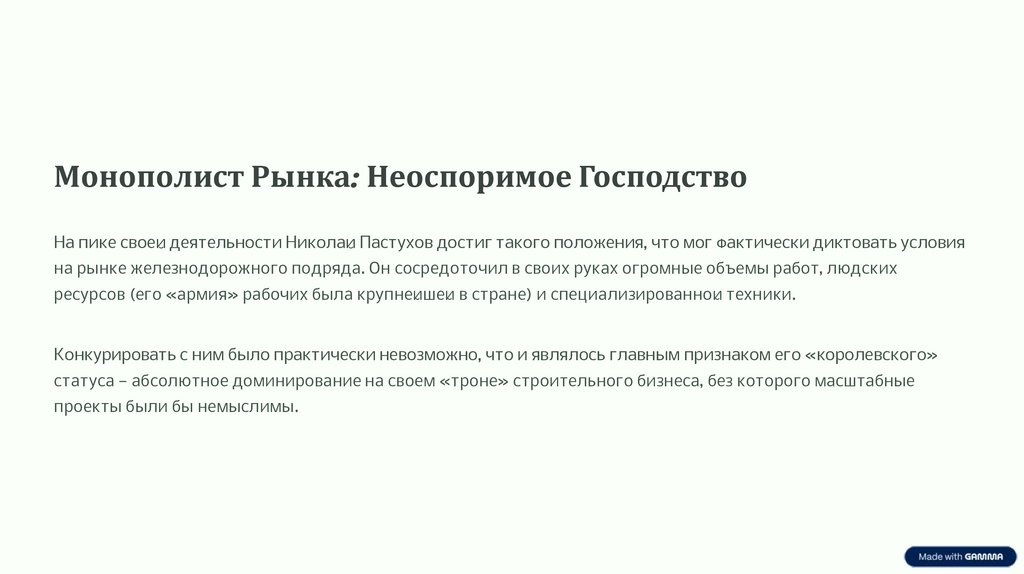 Монополист Рынка: Неоспоримое ГосподствоНа пике своей деятельности Николай Пастухов достиг такого положения, что мог фактически диктовать условия
