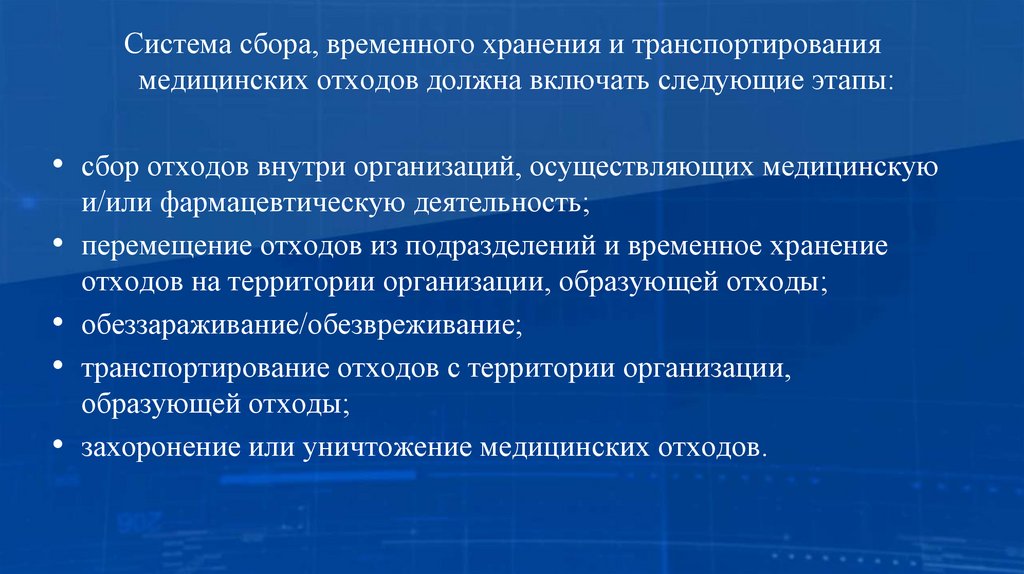 Система сбора, временного хранения и транспортированиямедицинских отходов должна включать следующие этапы: