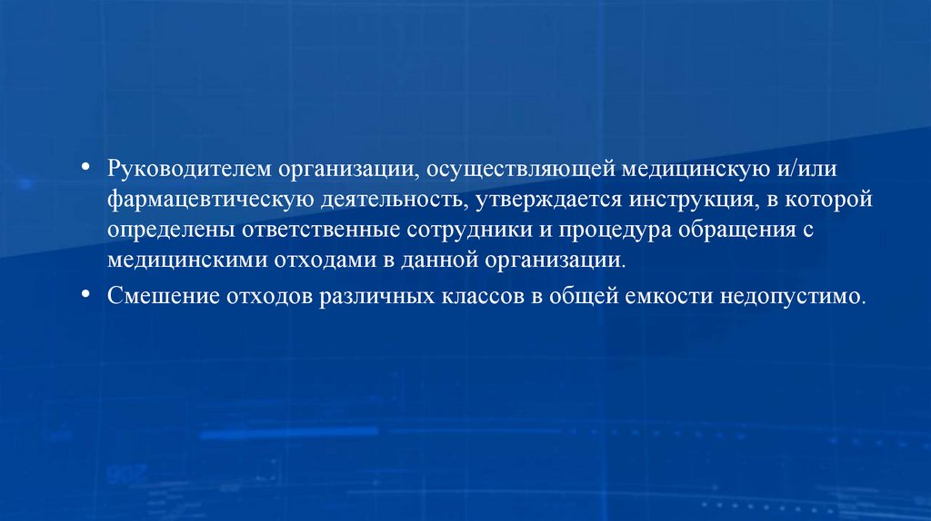 • Руководителем организации, осуществляющей медицинскую и/илифармацевтическую деятельность, утверждается инструкция, в которой