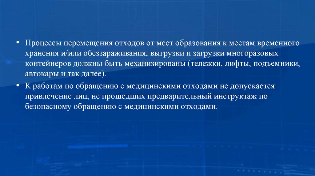 • Процессы перемещения отходов от мест образования к местам временногохранения и/или обеззараживания, выгрузки и загрузки многоразовых