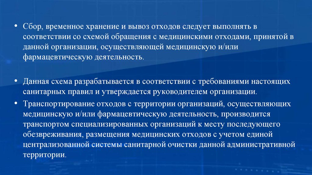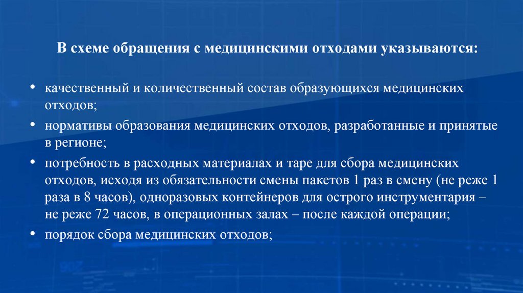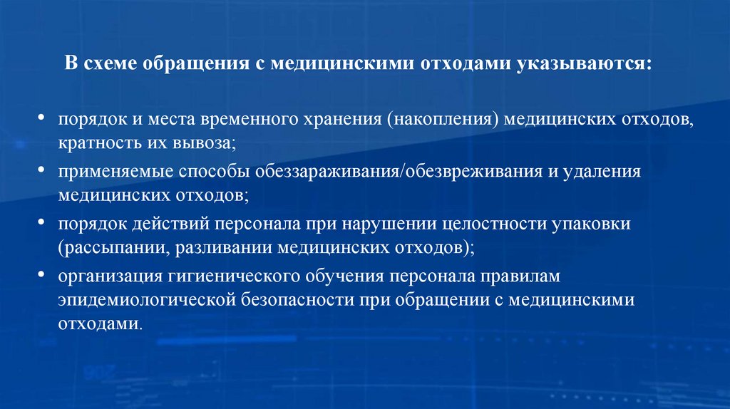 В схеме обращения с медицинскими отходами указываются:• порядок и места временного хранения (накопления) медицинских отходов,