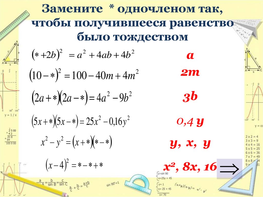 Замените * одночленом так,чтобы получившееся равенство
