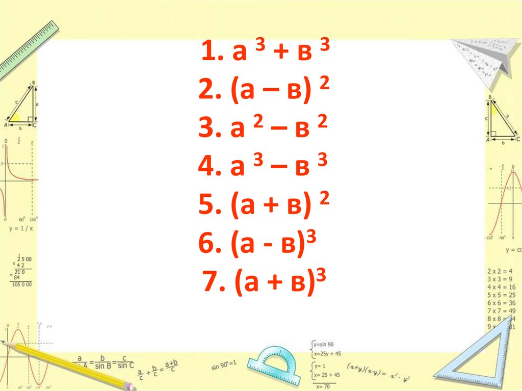 • Повторить формулысокращенного умножения.