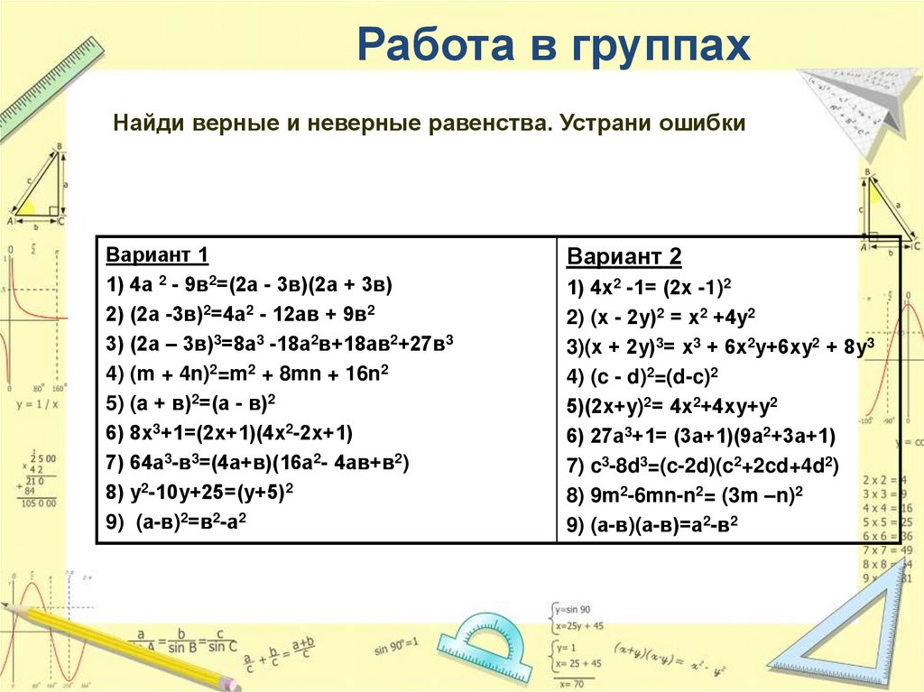 Работа в группахНайди верные и неверные равенства. Устрани ошибки