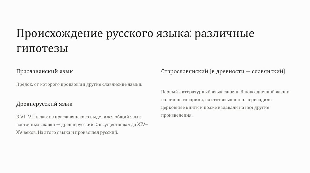 Формирование русского языкаВ XIV–XV веках древнерусский язык разделился на три ветви. Из него выделились русский, украинский и белорусский.