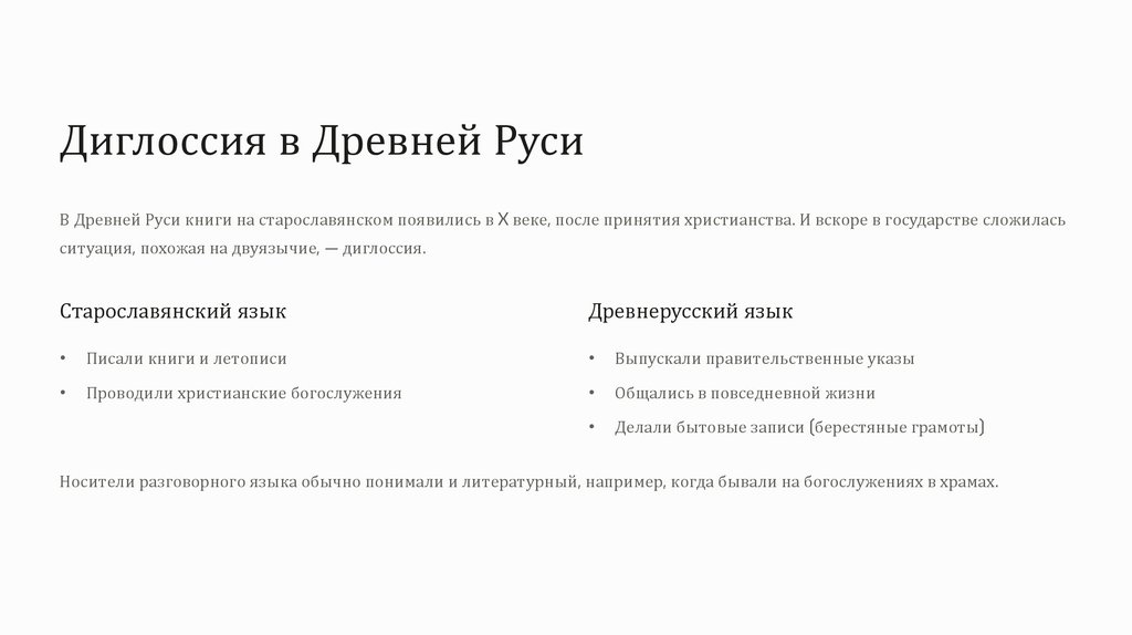 Диглоссия в Древней РусиВ Древней Руси книги на старославянском появились в X веке, после принятия христианства. И вскоре в государстве сложилась
