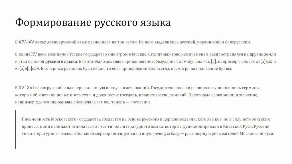 В конце XV века возникло Русское государство с центром в Москве. Столичный говор со временем распространялся на другие земли