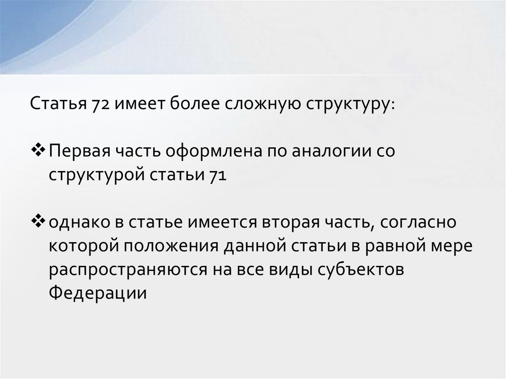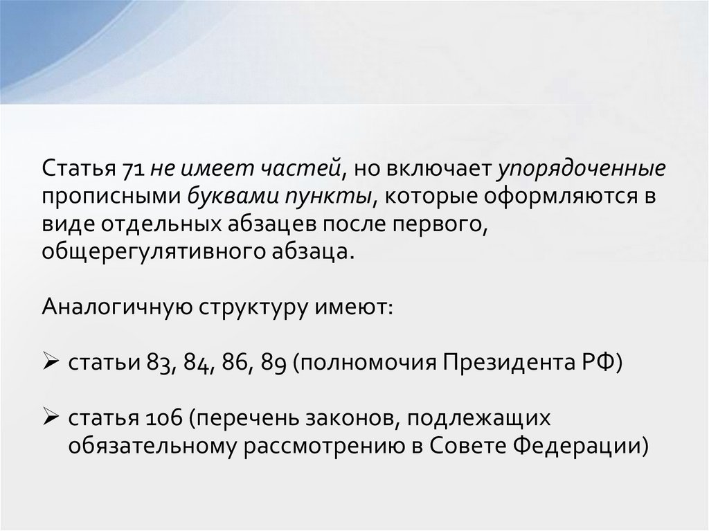 Статья 71 не имеет частей, но включает упорядоченныепрописными буквами пункты, которые оформляются в