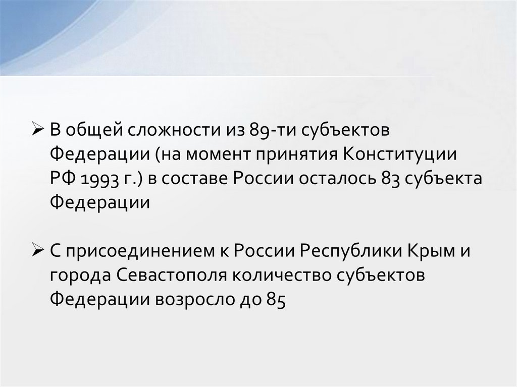 В общей сложности из 89-ти субъектовФедерации (на момент принятия Конституции
