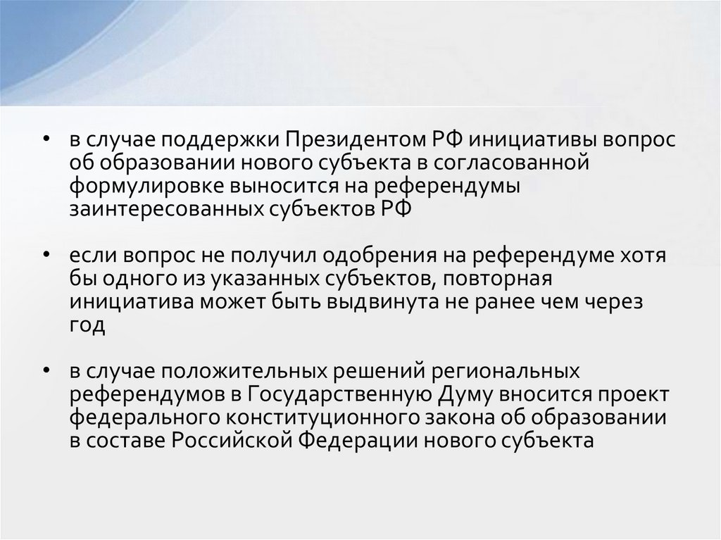 • в случае поддержки Президентом РФ инициативы вопрособ образовании нового субъекта в согласованной